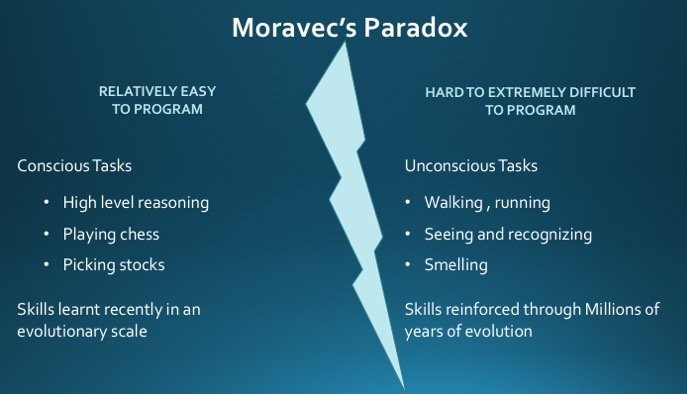 ‘Moravec’s Paradox’ …suggests that, contrary to traditional assumptions, high-level reasoning requires very little computation, but low-level sensorimotor skills require enormous computational resources. For IT planners working with business and customers this means in practice that the mental abilities of a four-year-old that we take for granted such as recognizing a face, lifting a pencil, walking across a room, or answering a question, are all much harder to automate, than say achieving adult level and expert-level performance on rules-based and reasoned-based processing such that an Adviser, or a Clinician might exhibit.