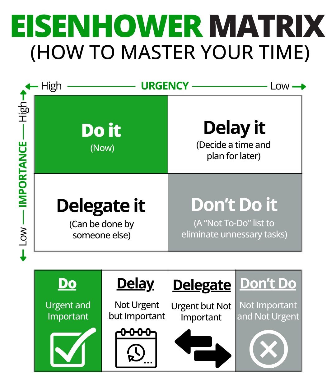 The ‘Eisenhower Matrix’ has four categories (or quadrants) with an extra very valuable time-based priority filter that considers ‘urgency’ and ‘importance’ (Do It and Delay it)