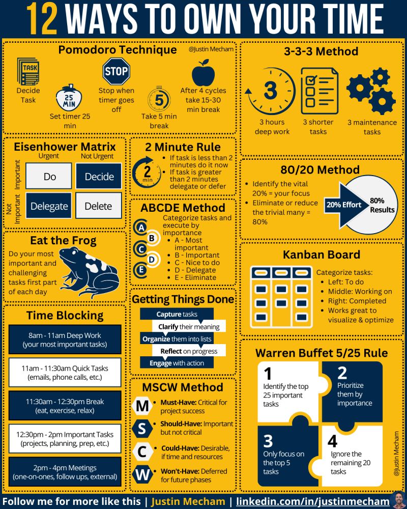 The above is a summary of 12 different time management techniques. These are all popular and easy to understand methods to assist with priority setting and time management planning. Thanks Justin Mecham. You can follow him on LinkedIn at: https://www.linkedin.com/in/justinmecham/