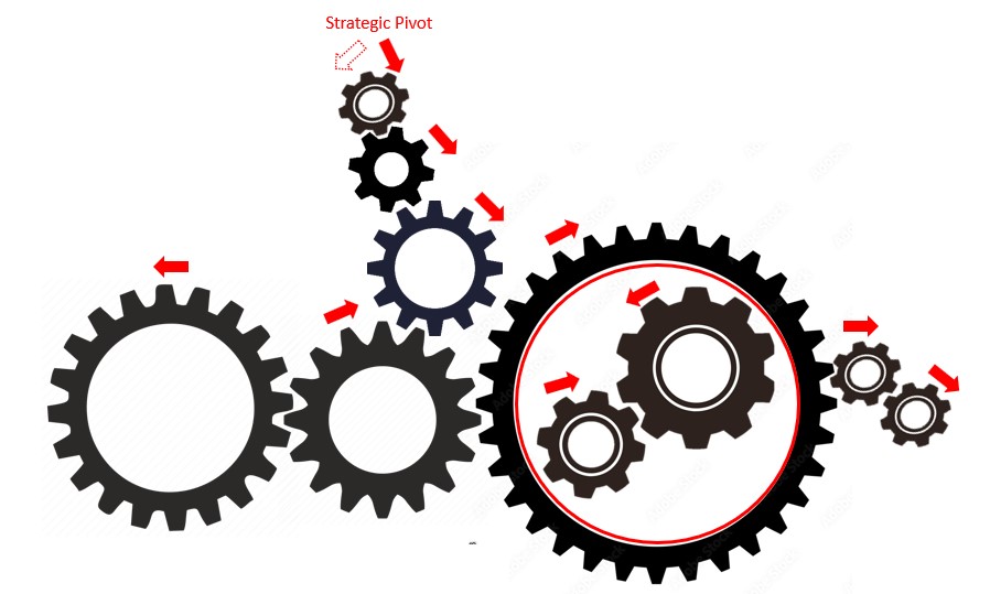 At the top level of an organization strategic business planning or a business opportunity might lead to a strategic pivot – it could be a smallish one less than 45 degrees in its ‘business impact’ degrees – or even a tiny one say only 2-3 notches in the cog or even just one notch at a time (BTW one notch at a time is like ‘continuous improvement’ – its no game-changer)