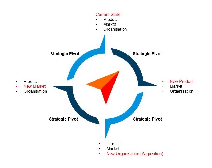 If you make four small strategic pivots (and mathematically each pivot is no more than say 45 degrees in ‘business impact’ degrees) you might end up halfway towards being back where you started.